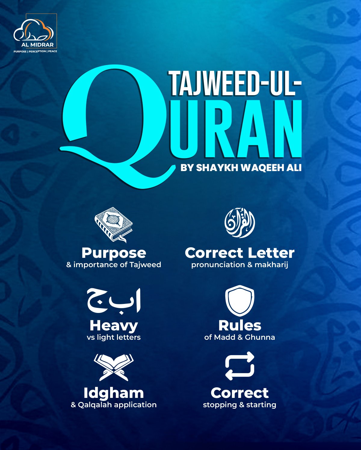 This is a structured and practical Tajweed program focused on correct application rather than memorization. Learners progress gradually, building confidence and control over their recitation while maintaining natural voice flow.